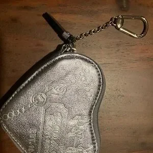 Chic heart-shaped bag by Coach. Features metallic gray leather with stylish print. Ideal for a fashionable touch.NWOT PURSE CHARM AND COIN PURSE!