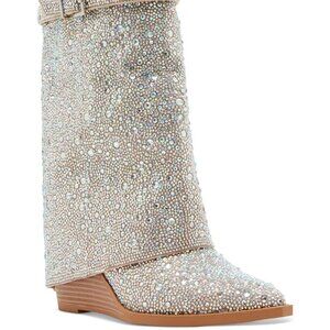 Allover rhinestone detailing; cuffed shaft with buckled strap
