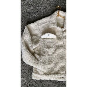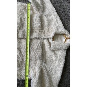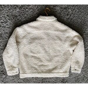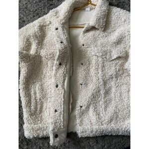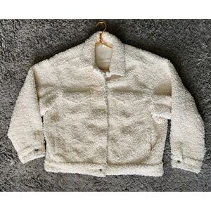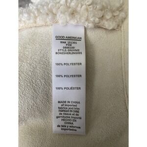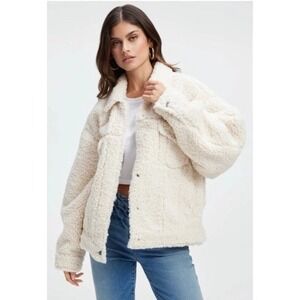 GOOD AMERICAN Women's Oversize Fleece Trucker Jacket. Crafted from fluffy high-pile fleece, this oversized trucker jacket is both cozy and chic. Color is Bone sterling. Collared Neckline, Oversized, Trucker Jacket Style, Snap Closure At Hip Length, with Front Patch Pockets & Side Slit Pockets. Retails for $189, sold out. Preowned in excellent condition.