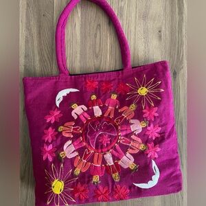 Great condition with minimal wear, inside is nice and clean. Cotton fabric tote with colorful embroidery of children, sun, moon, and flowers.