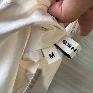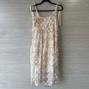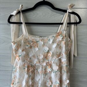 Romantic floral midi dress in a soft cream tone with peach and green rose embroidery. Features 3D floral appliqué, adjustable tie straps, and a back zipper closure. Lightweight and fully lined for comfort. Perfect for spring events, weddings, or a garden party.