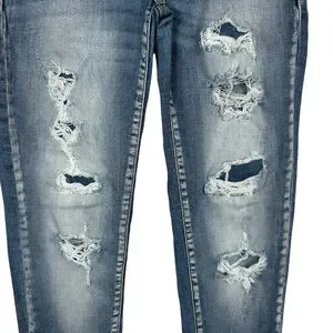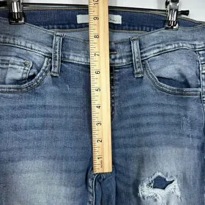 Kancan Distressed medium wash skinny blue jeans. Style # VBK1182R Size 27 Measurements in pictures.