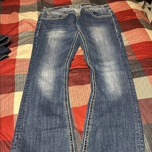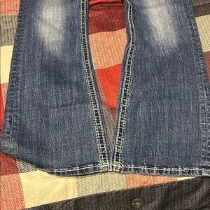 Stylish boot cut jeans. Classic blue denim. Embroidered back pocket. Perfect for casual wear.