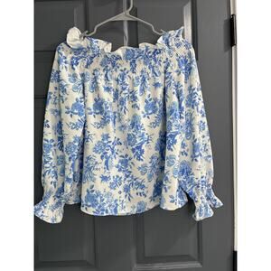 Tuckernuck Marguerite Blouse Top Off Shoulder Floral Boho Blue White Medium