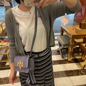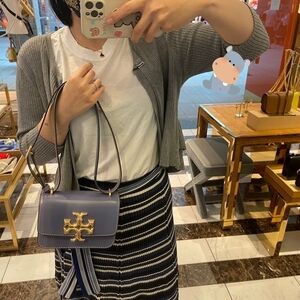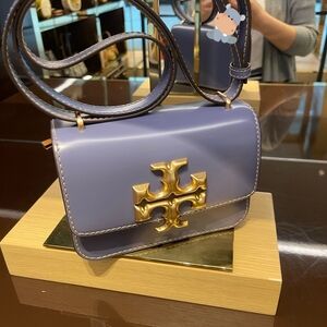 Elegant Tory Burch crossbody bag in a stunning purple shade. Features a signature gold logo accent. Perfect for adding a touch of luxury to any outfit.