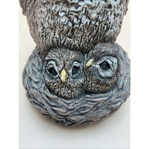 This vintage studio pottery figurine depicts a mother owl with two owlets in their nest, showcasing intricate details and a handmade touch. Handmade from earthenware, the piece captures the beauty and charm of nature, specifically focusing on the sweet scene of a family of owls in a cozy nest. Perfect for bird enthusiasts and collectors alike, this figurine is a unique and artistic addition to any home or collection. Photos show a couple minor flaws.