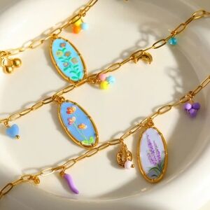 Vintage pendant style necklace with charms on a lovely pastel shade of cornflower blue. Features floral designs. Perfect for adding a playful touch.