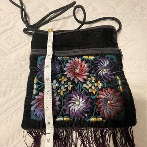 Elegant black velvet crossbody bag featuring vibrant floral embroidery. Perfect for adding a touch of color to any outfit.