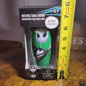 NWT Disney Nightmare before Christmas 5 piece nesting doll set. Featuring characters from The Nightmare Before Christmas. Vibrant green and purple colors. Measurements in pics.