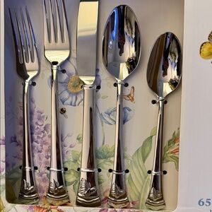 Elegant flatware set by Lenox. Features silver finish with gold accents. Perfect for any dining occasion.