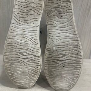 Stylish black leather ankle boots featuring white soles and side zippers. Good pre-owned condition. Signs of wear on the soles and a tiny scuff on the left toe (see pics). Double zippers and inside faux fur lining.