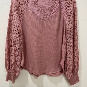 Free People Women's Small Dusty Rose Embroidered Crochet Waffle Knit Blouse Top