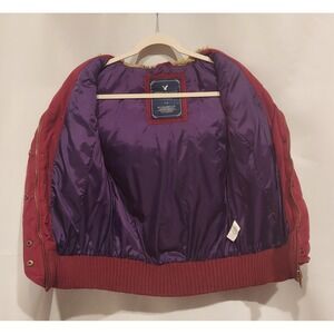 In good preowned condition. No flaws. Just some light wear. Put some close-ups in the pics. No piling. Full-zip and snap closure. Snap closure on pockets. Inside of pockets is a super soft fleece material. Inside hood is a brown faux fur. Bottom is like a sweater material. Color is maroon or burgundy. Size large.