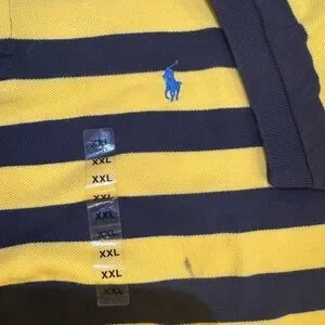Classic polo with bold navy and yellow stripes. Features a traditional collar and button placket.