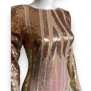 This stunning dress features an abstract pattern sequin design with a back split hem, high neckline, long sleeves, and a low back. Fully lined, Midi length, Back zip. This is a Show Stopper. It will absolutely turn heads!