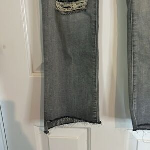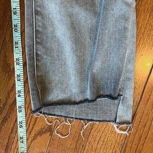 Adorable! In excellent condition. No flaws or signs of wear noted. Size 24, which is equivalent to a US size 2– see mother size chart. Gray wash. Fun step fray detailing at hem. Intentional distressing at knee. Perfect for any season. Super stretchy and comfy.