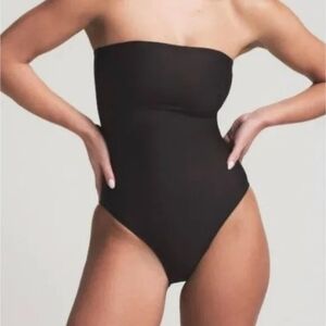 "Poolside knockout. Show off your shoulders in this sexy strapless one piece with medium back coverage and removable, convertible straps with a swan hook closure. Features a SKIMS logo detail at the center back"