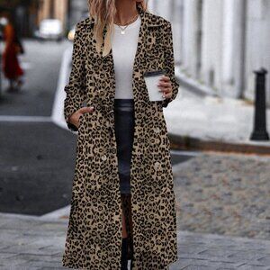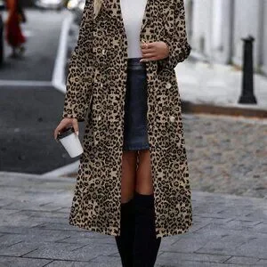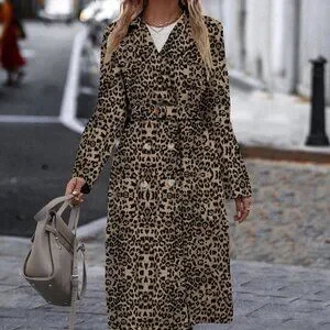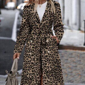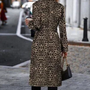Multicolor Casual Women's Cinched Waist Leopard Print Trench Coat
