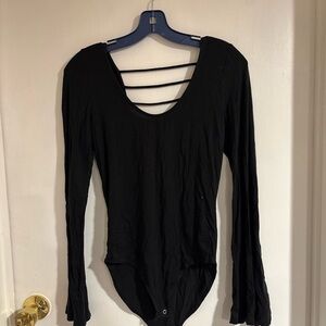 Chic black bodysuit with long sleeves. Features a stylish strappy back design. Ideal for versatile styling.