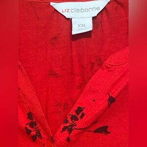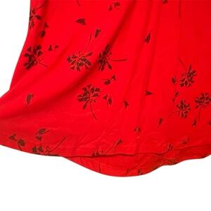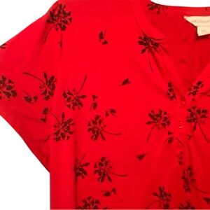 Bright red top with black floral pattern. Short sleeves and v-neck design.