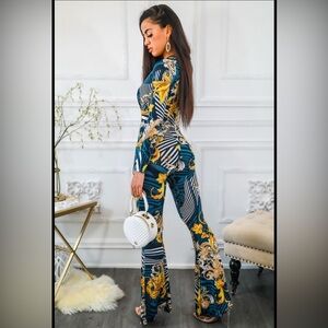 Step out in style with this vibrant floral print jumpsuit. Perfect for any occasion, this jumpsuit features a stunning mix of blue and yellow hues. Elevate your wardrobe with this chic and comfortable piece.