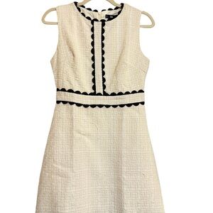 Chic mini dress with scalloped black trim. Cream boucle tweed textured fabric. Sleeveless design. Zip back. 16.5” chest, 13.5” waist, 32” long