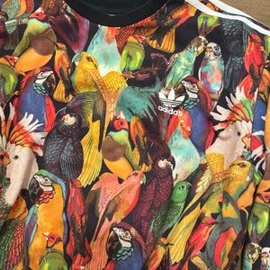 Bold Adidas and Farm Rio sweatshirt with vibrant graphic design. Features black trim and multicolor pattern. Parrots and cockatoos. Rare and hard to find!