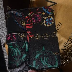 Stylish crossbody bag with vibrant multicolor floral design. Features luxurious gold chain strap. Perfect for adding flair to any outfit.