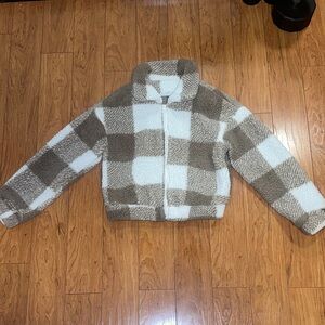Cozy plaid sherpa jacket with a zip closure. Features a stylish brown and cream checkered pattern.