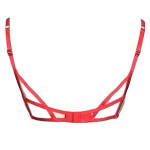 This ultra-romantic bra features delicate red floral appliqués layered over sheer mesh cups, supportive underwire, and a dramatic strappy cage-style back. Finished with charming bow details on the adjustable straps, this piece perfectly blends elegance with a bold, lingerie-forward edge.