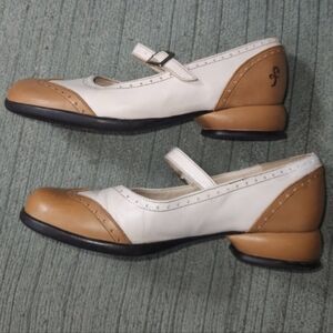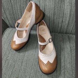 🌿 John Fluevog Fellowships Kathy low-heeled Mary Jane shoes. Tan + white leather, wingtip loafers, nonslip soles, leather footbeds, fun chunky 1" inch heels. From the Fellowship family. Everyone loves the classic Mary-Jane, vibrant colours, brogueing details.