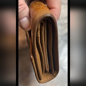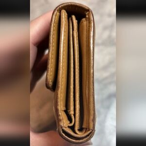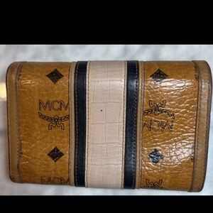 Chic MCM wristlet in tan and black leather. Ideal for a fashionable outing.