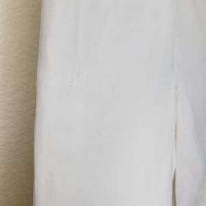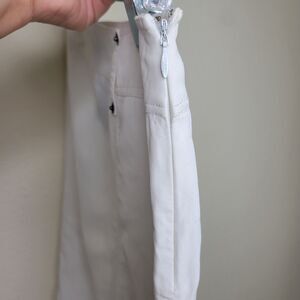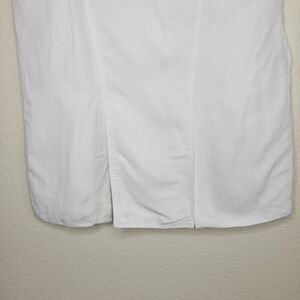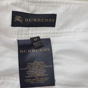 BURBERRY White 100% Linen Knee Length Skirt Size 42 back side the of skirt is Mesh Lined with flap slit and a side zip closure. Skirt has some scuffing throughout the fabric shown in photos, and zipper pull has some dings, but in overall good pre-owned condition. Please see photos for approximate measurements and condition.