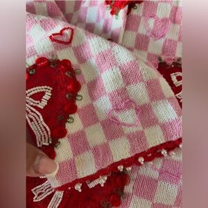 Charming pink and red heart sweater with checkered pattern. Perfect for cozy days.
