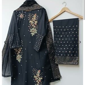 Category: 3Pc, Shirt, Trouser, Organza Dupatta Fabric: Raw Silk Shirt Length: 44 Elevate your casual style with this stunning 3PC Raw Silk Suit from my Store. The fully sequin-embellished and handmade detailed shirt (44 inches) brings a touch of sparkle and finesse,...