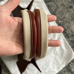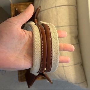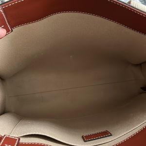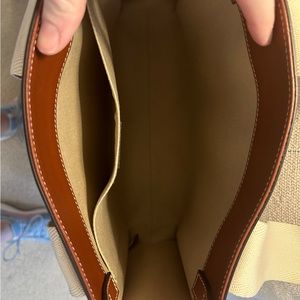Elegant brown tote with cream straps. Medium Leather Woody Tote. Perfect for everyday use.