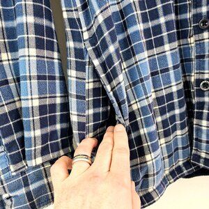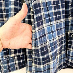 Style and Materials: Navy Blue and Neutral earthy tones. Plaid Flannel. 100% Soft Cotton. Lining 100 % Polyester. Heavy Button down shirt. 2 front (chest) pockets. 2 side pockets. Shacket style. Unisex style as well. Work. Barn chores. Outdoors. Farm. Cold weather.