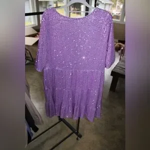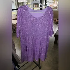 Stunning purple dress covered in all-over sequins for the perfect amount of sparkle! Features a flattering scoop neckline, short sleeves, and a flowy babydoll silhouette that’s comfortable while still making a statement. Fully lined for easy wear.
