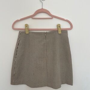 This tailored mini skirt features a neutral plaid print in a flattering A-line silhouette. Fully lined with invisible side zip for a clean, polished look. Ideal for year-round styling — wear it with tights and boots in cooler months or a tank and sneakers in spring.