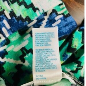 Colorful pants with a striking geometric pattern. Features shades of blue, green, and yellow.