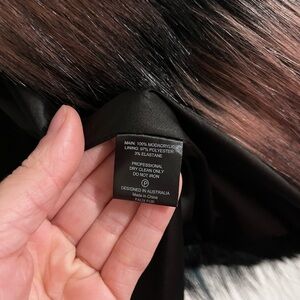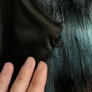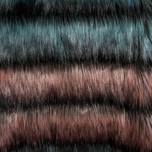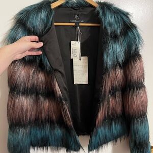 Chic faux fur jacket with bold teal and burgundy stripes. Perfect for a stylish, warm look.