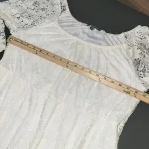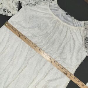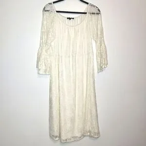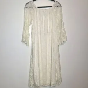 Item: women's all-over lace dress with flared bell sleeves, white in color and would make a beautiful casual wedding dress, hits just below the knee, size XL