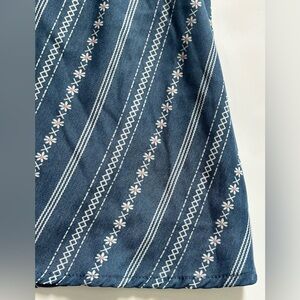 This casual sundress by Lily Bleu features a charming blue and white striped pattern, complemented by a square neckline and cap puff sleeves. The ruffled details add a playful touch, making it perfect for a relaxed day out.