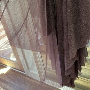 Beautiful Terani Couture flowy gown with v neck and pointed symmetrical hemline. This dress is beautiful on, very flowy and flattering, drapes so well. The color is mauve with threads of silvery sparkle, and a beaded waist. A dress lining underneath that sits just above the knee. Has cups in the top so no need for a bra! So comfortable! Size is 4. This dress is so lovely!