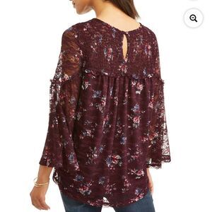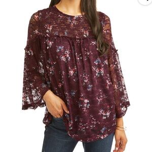Time and Tru Printed Lace Peasant Top smocking lace front yoke, bell sleeves and lightweight flowy fabric, Like New