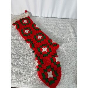 Keywords: crocheted Christmas stockings, handmade holiday stockings, vintage Christmas decorations, granny square stockings, red green white Christmas, heirloom Christmas stockings, festive home decor, holiday gift stockings, cozy Christmas stockings