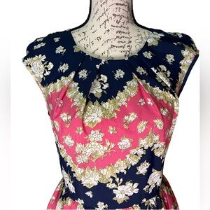 It’s really lightweight and has a pretty pattern with navy blue/cream/pink/white colors that can be dressed up or dressed down. It has a hidden zipper on the side and cute details.