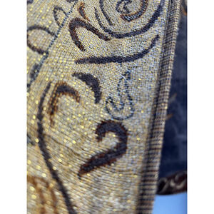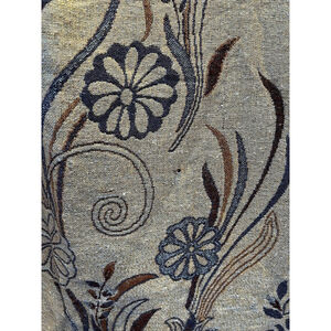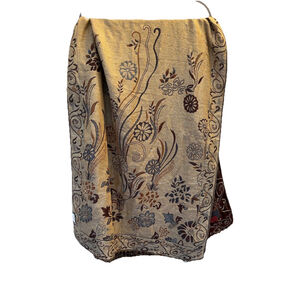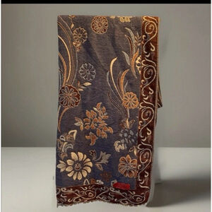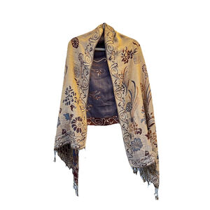 The scarf features a reversible design, allowing two distinct looks in one piece. One side showcases a soft neutral base with floral and scroll motifs, while the reverse presents a deeper contrasting tone with coordinating patterns. Finished with delicate fringe edges, this piece drapes beautifully whether worn as a scarf, shawl, or wrap.