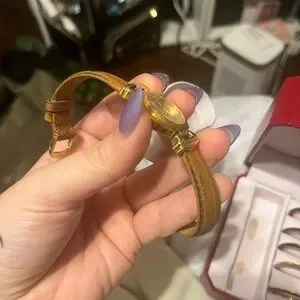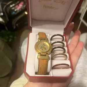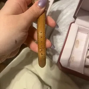 Armitron watch featuring a gold face and tan leather strap. Comes with multiple interchangeable bands. In pretty rough condition, watch itself looks corroded and the band is pretty worn out. Could be a cool project to make new again! Unknown if the watch works but needs a new battery for sure.