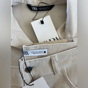 Elegant beige corduroy set from Zara. Includes a jacket with a front pocket and matching trousers.